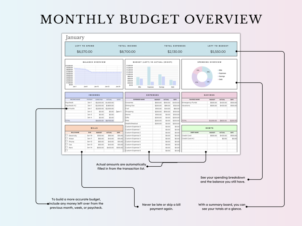 𝗠𝗼𝗻𝘁𝗵𝗹𝘆 𝗕𝘂𝗱𝗴𝗲𝘁 𝗦𝗵𝗲𝗲𝘁𝘀 𝗳𝗼𝗿 𝗘𝗮𝗰𝗵 𝗠𝗼𝗻𝘁𝗵 𝗼𝗳 𝘁𝗵𝗲 𝗬𝗲𝗮𝗿: Access dedicated budget sheets for each month, allowing you to meticulously plan and manage your finances on a month-to-month basis. Keep track of your savings, expenses, bills, and debts effortlessly with a user-friendly interface.