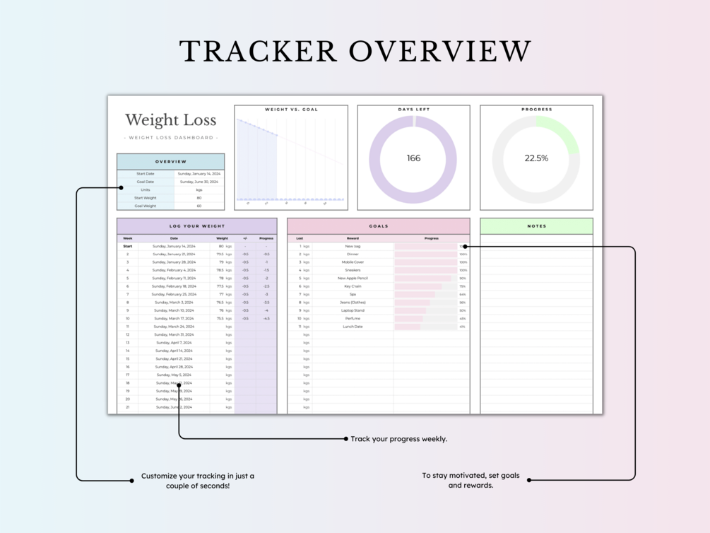 Effortlessly monitor your weight loss journey with our Google Sheets Weight Loss Tracker. Set personalized goals, track progress through various charts, and stay motivated with built-in milestones and rewards. Includes a comprehensive tutorial video and a bonus body measurement log. Start achieving your fitness goals today! ๐ช๐